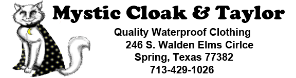 lightweight yet fully functional as all weather garments. Please call to order as we have 7 sizes and several fabric; and color options. Our cloaks are made out of several different fabrics; the most notable one is upholstery micro-suede which is the highest grade we can find. This makes for a lightweight cloak that is very durable when we couple this to our unique waterproof lining that we have milled specifically for us.